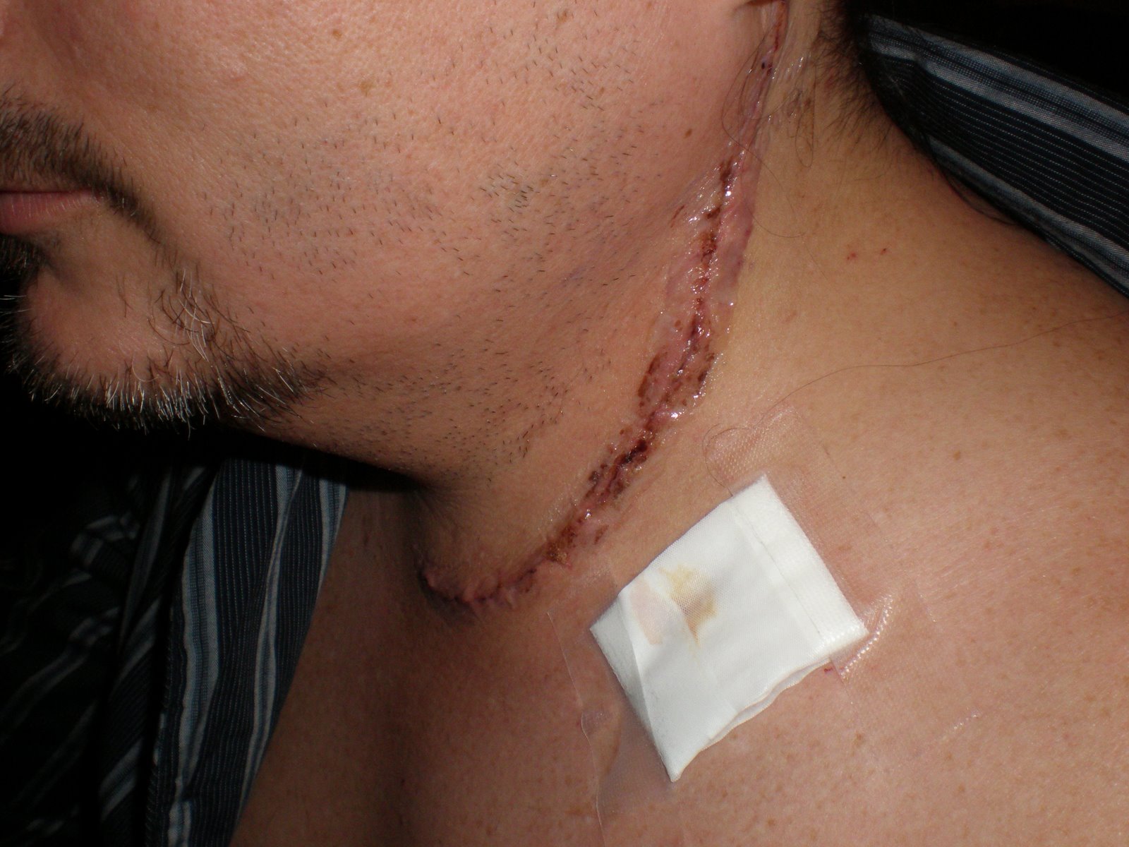 Above is my scar. I’s about 10 inches long and is sexy as hell. The patch is where the drainage tube was that evacuated excess fluid from my neck. It’s gone now, obviously.